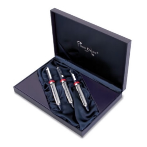 Excepcional set de gran calidad, en formato 3 piezas: bolígrafo, pluma y portaminas. Su línea elegante y a su vez vanguardista, combinado con colores marinos y rojos, junto al acero brillante, hace de este conjunto una pieza única.